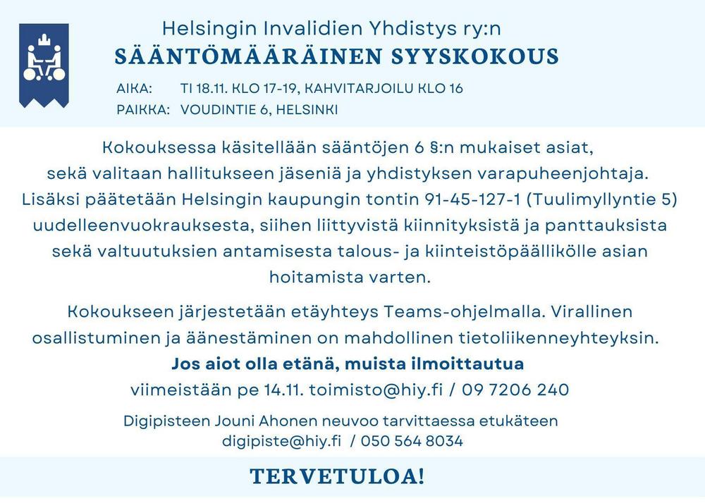 Yhdistyksen sääntömääräinen syyskokous pidetään tiistaina 18.11. klo 17-19. Kokous järjestetään yhdistyksen toimintakeskuksessa Voudintie 6:n salissa ja Teams-ohjelmalla. Kahvitarjoilu klo 16 alkaen.…