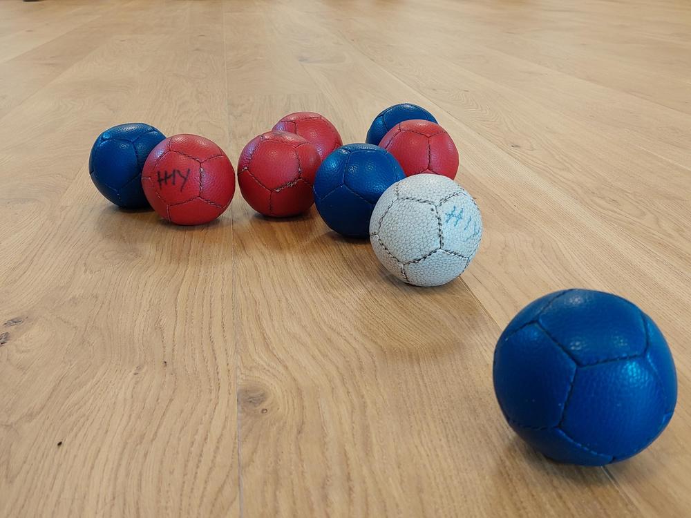 Sisällä pelattaessa käytetään pehmeitä, nahkapintaisia pelipalloja. Pelipalloista kuusi on punaisia ja kuusi sinisiä. Näiden lisäksi peliin kuuluu samasta materiaalista valmistettu samankokoinen valkoinen maalipallo.